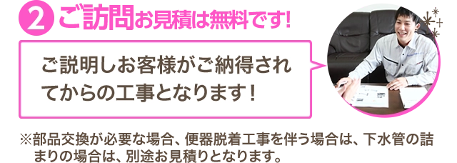 お客様宅にお伺いいたしましたら、まずトラブルが起きているトイレまわりの点検に入ります。そのときにトラブルの心当たりなどをスタッフにお伝えください。