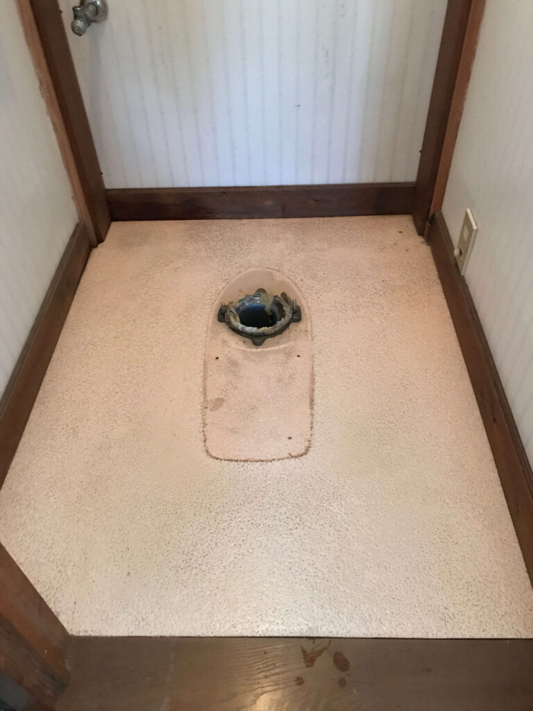 便器本体を撤去した後は、普段は便器の陰になって掃除できない部分も掃除できるので、埃や汚れを綺麗に拭き上げて行きます。