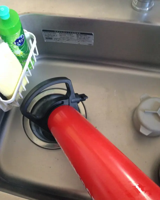 ローポンプの圧力が逃げないよう、排水口を覆うように押し当てて、ゆっくりとレバーを引き抜きます。