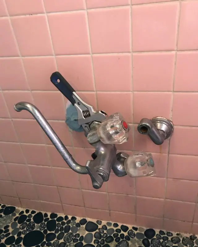 しっかりと止水できている事が確認できたら、蛇口本体の後ろに付いているナットを工具でゆるめて、壁と蛇口を繋ぐ取付脚という部品を残して、蛇口本体を先に取り外します。