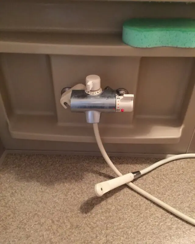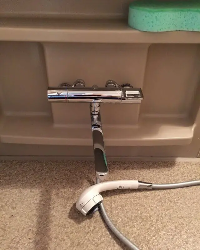 お風呂(浴室)の蛇口 水が止まらいトラブル対応 浴室用蛇口の壁付きシャワータイプ サーモスタット混合水栓交換・取り替え修理作業 熊本県阿蘇市竹原