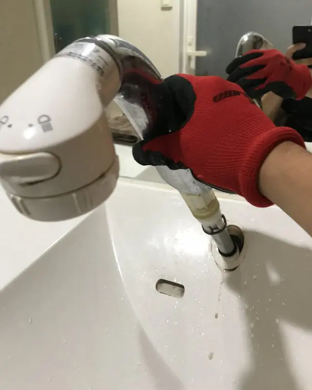 洗面台の裏から、工具を使って蛇口を固定しているナットを外し、慎重に蛇口本体を洗面台から引き抜きます。