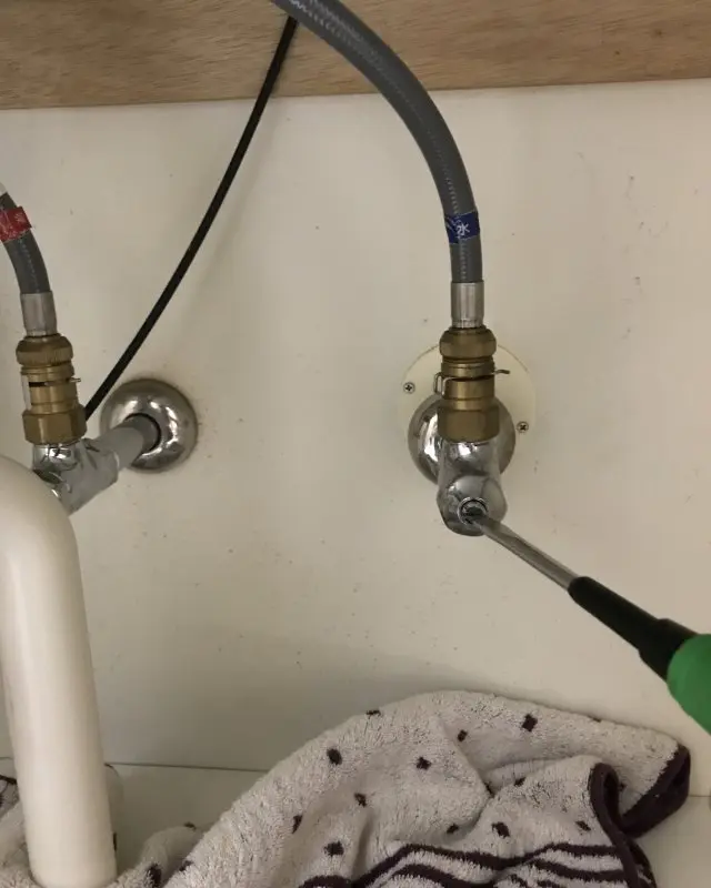 繋ぎ込み作業が終わったら、止水栓を開いて蛇口に通水し、継ぎ目から水漏れを起こしていないか、蛇口は正常に動作しているかを点検し、問題がなければ全ての作業が完了です。